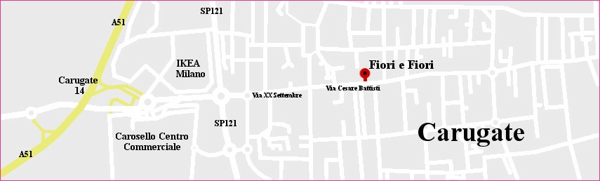 Il negozio Fiori e Fiori si trova a Carugate (Milano) in Via Cesare Battisti 50. Una volta raggiunto Carugate potete trovarlo seguendo le indicazioni per Fiori e Fiori. Si trova a circa 5 minuti dal supermercato Carosello (15 minuti a piedi). Potete trovare spazio per parcheggiare di fronte al negozio o nelle vie laterali.