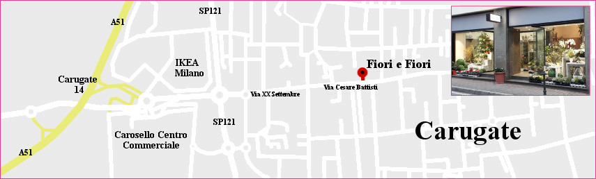 Il negozio Fiori e Fiori si trova a Carugate (Milano) in Via Cesare Battisti 50. Una volta raggiunto Carugate potete trovarlo seguendo le indicazioni per Fiori e Fiori. Si trova a circa 5 minuti dal supermercato Carosello (15 minuti a piedi). Potete trovare spazio per parcheggiare di fronte al negozio o nelle vie laterali.